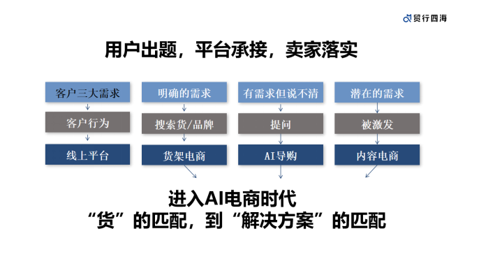 随着AI电商时代的到来,平台开始将搜索、对话、多模态展示等各类方式整合,开始将用户的三大需求进行融合,从之前满足用户找商品what的需求,朝着挖掘和满足用户找解决方案how的需求去进化。