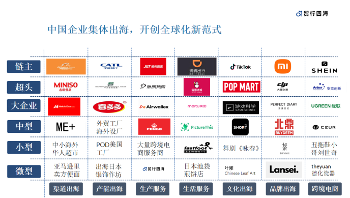 有别于此前欧美日韩以大企业主导的全球化,中国企业出海的大军中,既有行业链主,也有着大量的中小微企业,甚至众多的个体创业者。价值链上的每个生态位,都能找到中国企业的身影。
