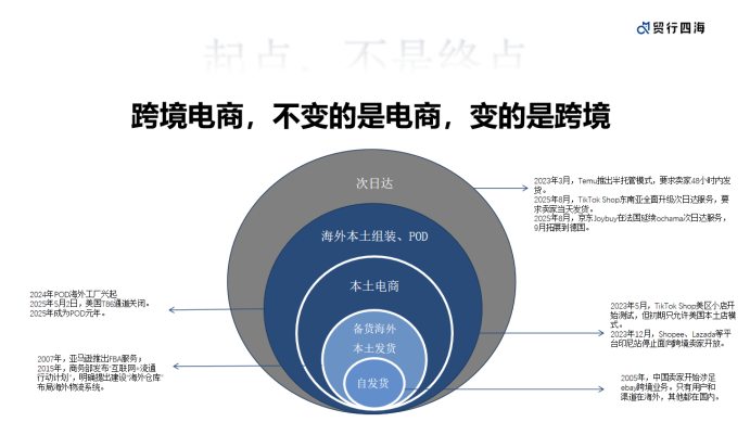 正如这个图所展示的,跨境电商行业这几年在不断地去跨境化,从普遍备货到海外仓,到海外设立主体,以本土电商面目进行原因,再到海外组装、定制、生产,再到与海外价值链共生。跨境电商,跨境只是起点,不是终点。